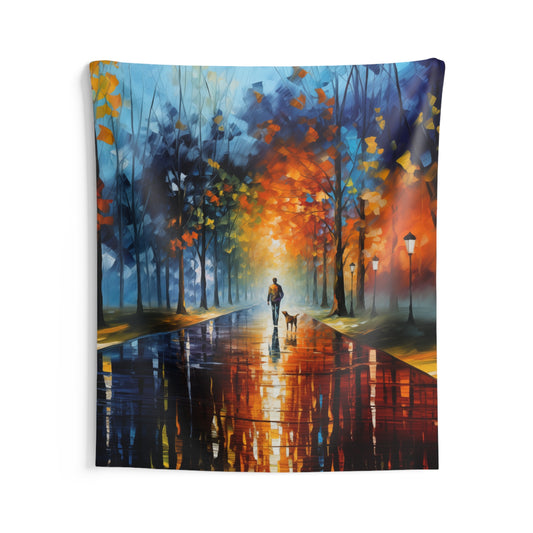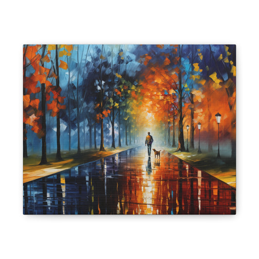 Man and Mutt Walking On Colorful Shiny Rainy Road - Canvas Gallery Wraps