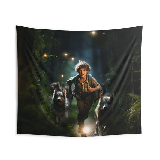 Boy Runs With Dogs At Night - Hanging Wall Tapestry